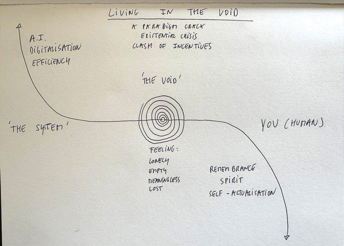An in between stage: moving away from systems we no longer want to be part of and are accelerating towards even more ‘non-human’ metrics. All while going through exponential personal growth, only increasing the distance between you and The System and in doing so creating The Void.